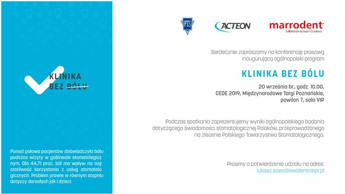 KONFERENCJA PRASOWA. Nieco wyżej pisałem, że stomatologia ma być jeszcze bardziej komfortowa – to prawda, tymczasem, z badania przeprowadzonego na zlecenie Polskiego Towarzystwa Stomatologicznego wynika, że prawie połowa pacjentów doświadczyła bólu u dentysty. Więcej danych przedstawimy w ramach konferencji prasowej inaugurującej program „Klinika bez Bólu”. Będzie to oczywiście premiera wyników.